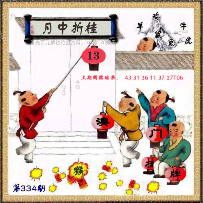 | 334期挂牌《月中折桂》 解释:字面指在月亮中折取桂树枝,后比喻科举及第。 解:后比喻科举及第。解吉肖马羊蛇兔龙鸡,挂:13爆:猴。 七肖:猴蛇兔马羊龙鸡 |